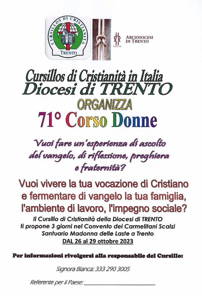 71° corso donne Cursillo di cristianità Trento Quando 26/10/2023 - 29/10/2023 Tutto il giorno Aggiungi al calendario Download ICS Google Calendar iCalendar Office 365 Outlook Live